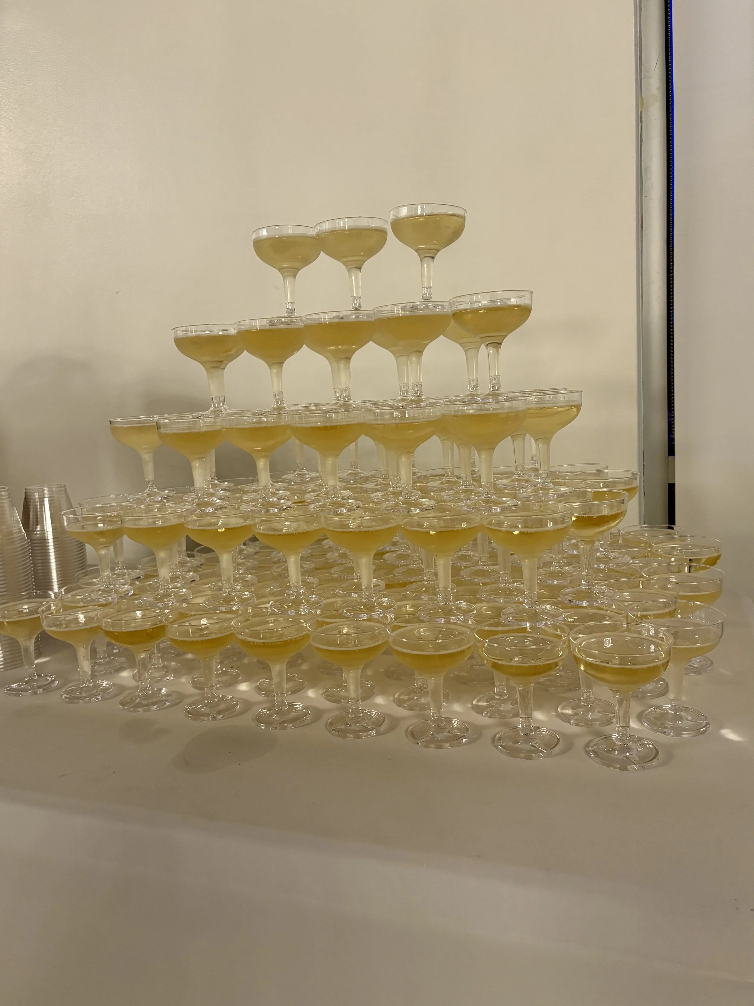 An elegant tower of champagne coupes, perfectly styled for your celebration. A sparkling centerpiece that adds instant glamour and photo-worthy appeal to your event.